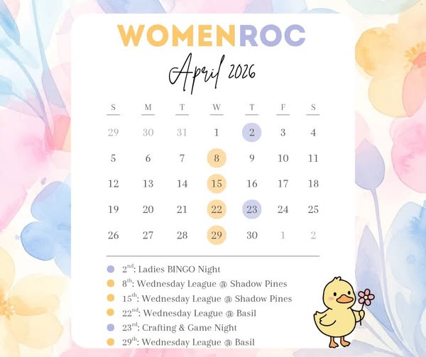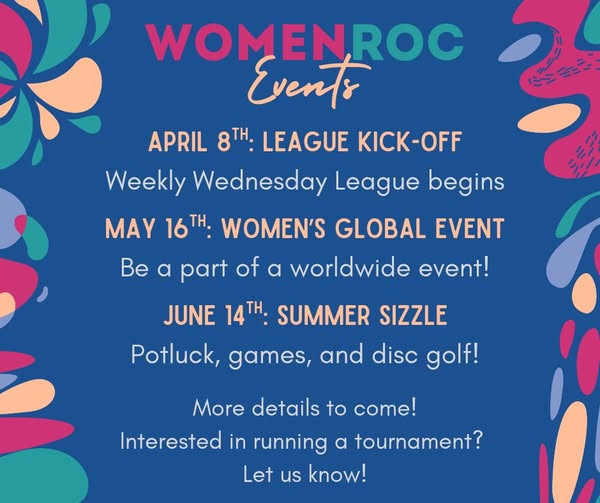 Here we are – April! And just like that, our season of weekly events is upon us! We start off our WomenROC Wednesday League THIS Wednesday (4/8) @ Shadow Pines. It’s completely free, & we have discs for you if you need some! We tee off @ 5:30, but if